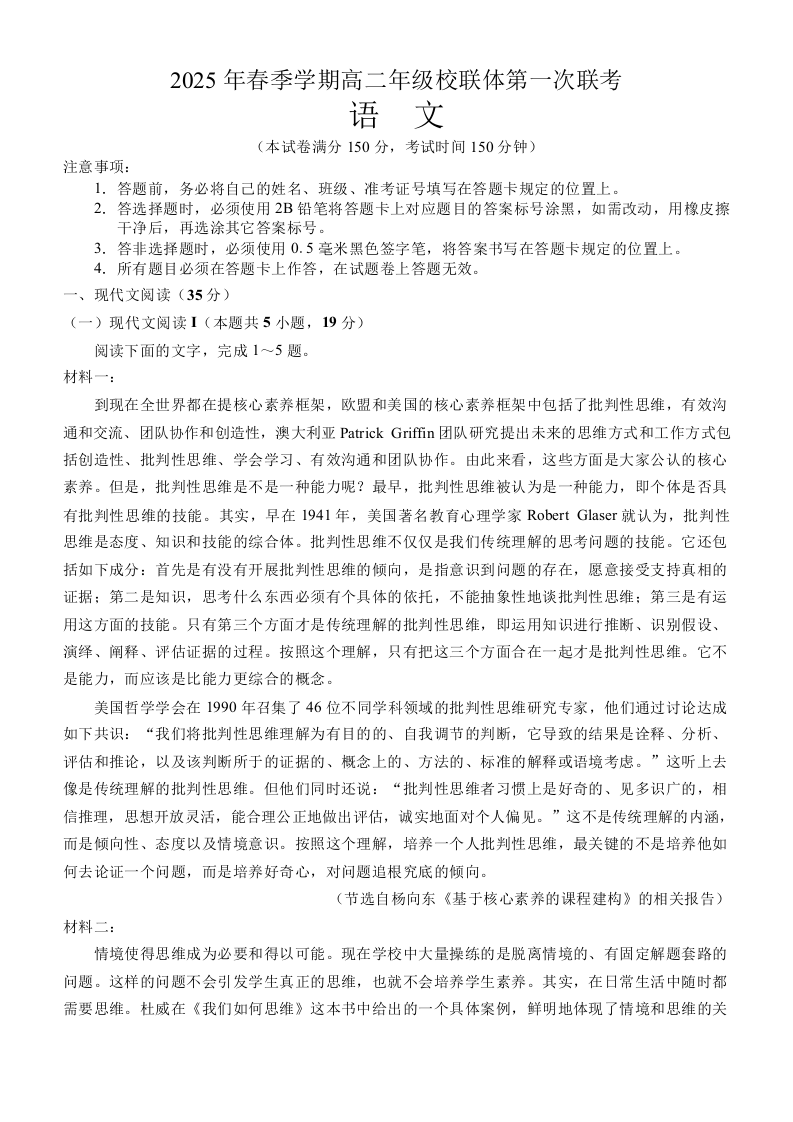 广西壮族自治区河池市十校联体2024-2025学年下学期高二第一次联考语文