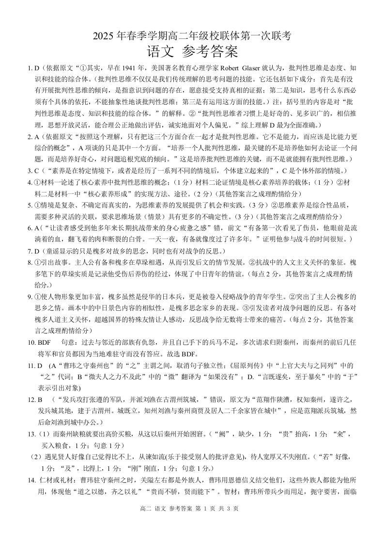 广西壮族自治区河池市十校联体2024-2025学年下学期高二第一次联考语文答案