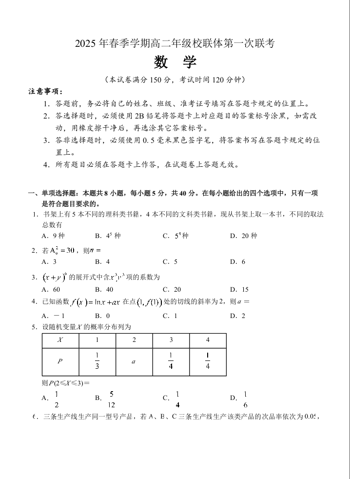 广西壮族自治区河池市十校联体2024-2025学年下学期高二第一次联考数学