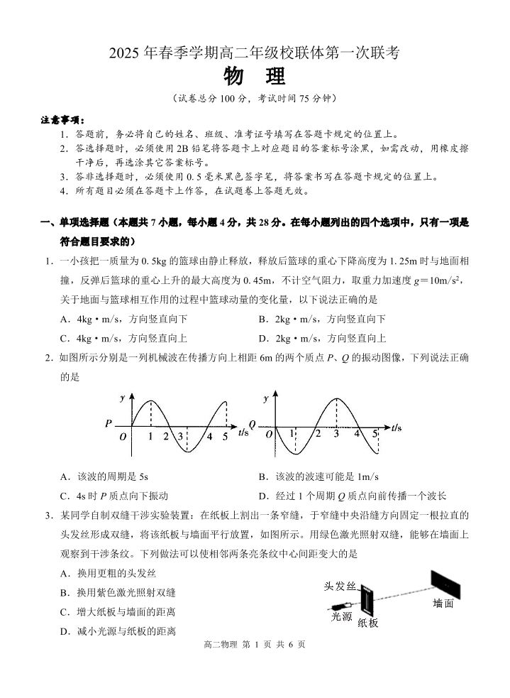 广西壮族自治区河池市十校联体2024-2025学年下学期高二第一次联考物理+答案