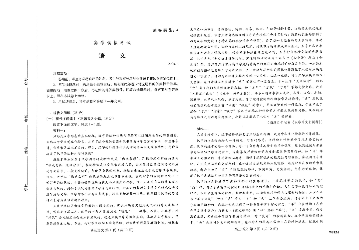 山东省潍坊市2024-2025学年下学期4月高三高考二模统考语文