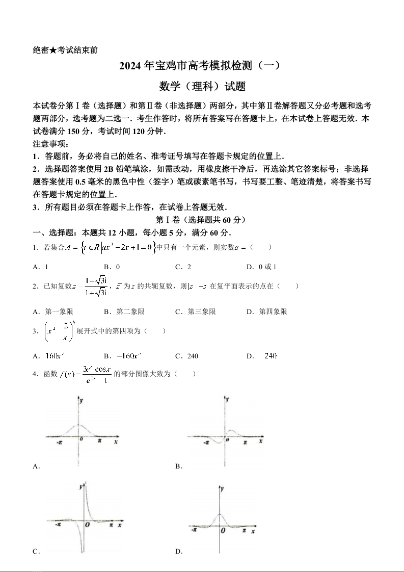 陕西省宝鸡市2024届高三上学期高考模拟检测(一)理科数学