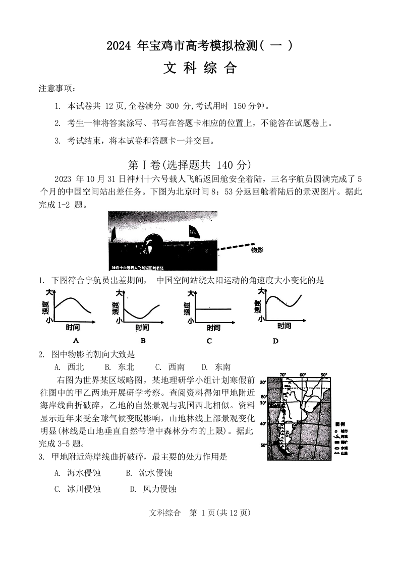 陕西省宝鸡市2024届高三上学期高考模拟检测(一)文综