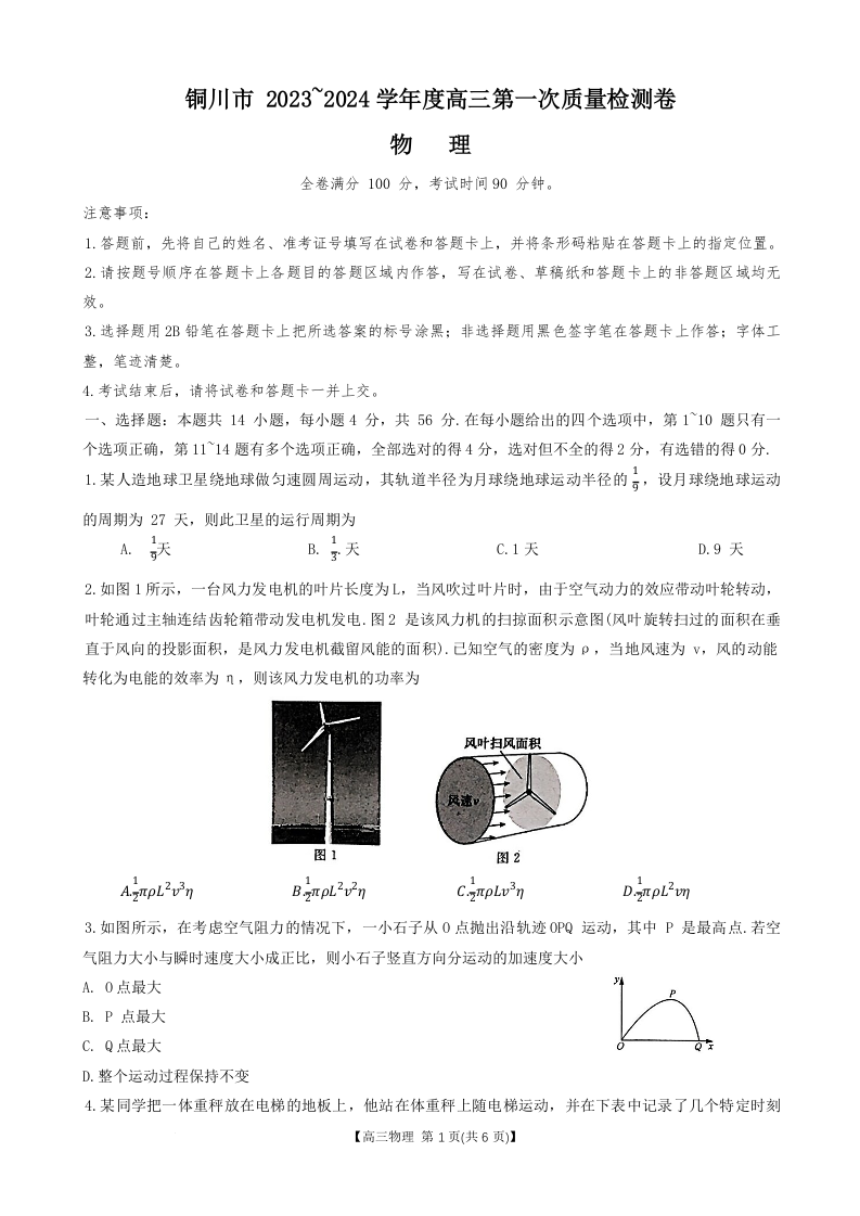 2024届陕西省铜川市高三上学期第一次模拟考试物理试题