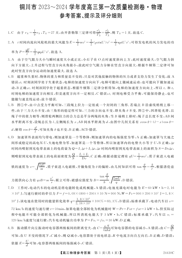 2024届陕西省铜川市高三上学期第一次模拟考试物理试题答案