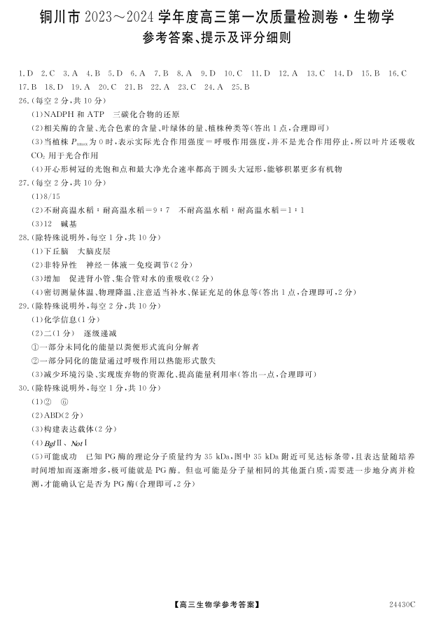 铜川市2023—2024学年度高三第一次模拟考试 生物答案