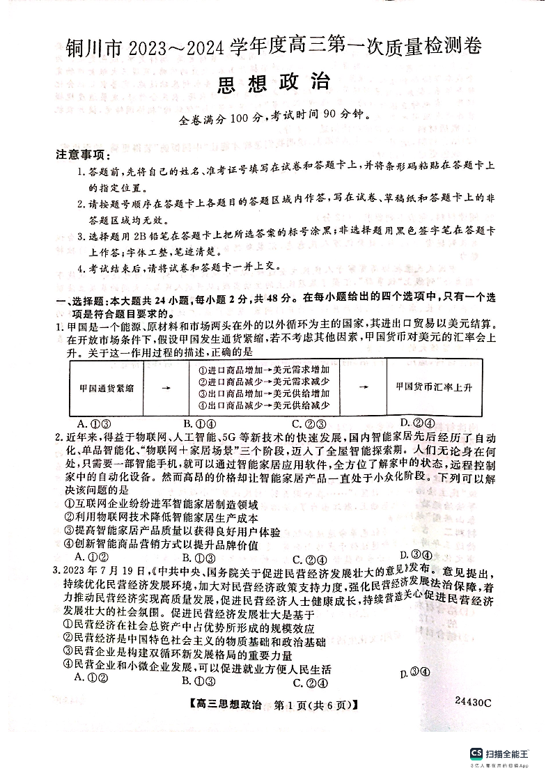 铜川市2023—2024学年度高三第一次模拟考试 政治