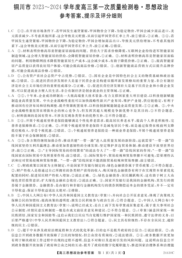 铜川市2023—2024学年度高三第一次模拟考试 政治答案