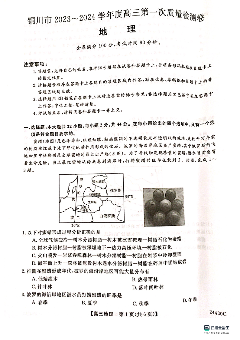 铜川市2023—2024学年度高三第一次模拟考试 地理
