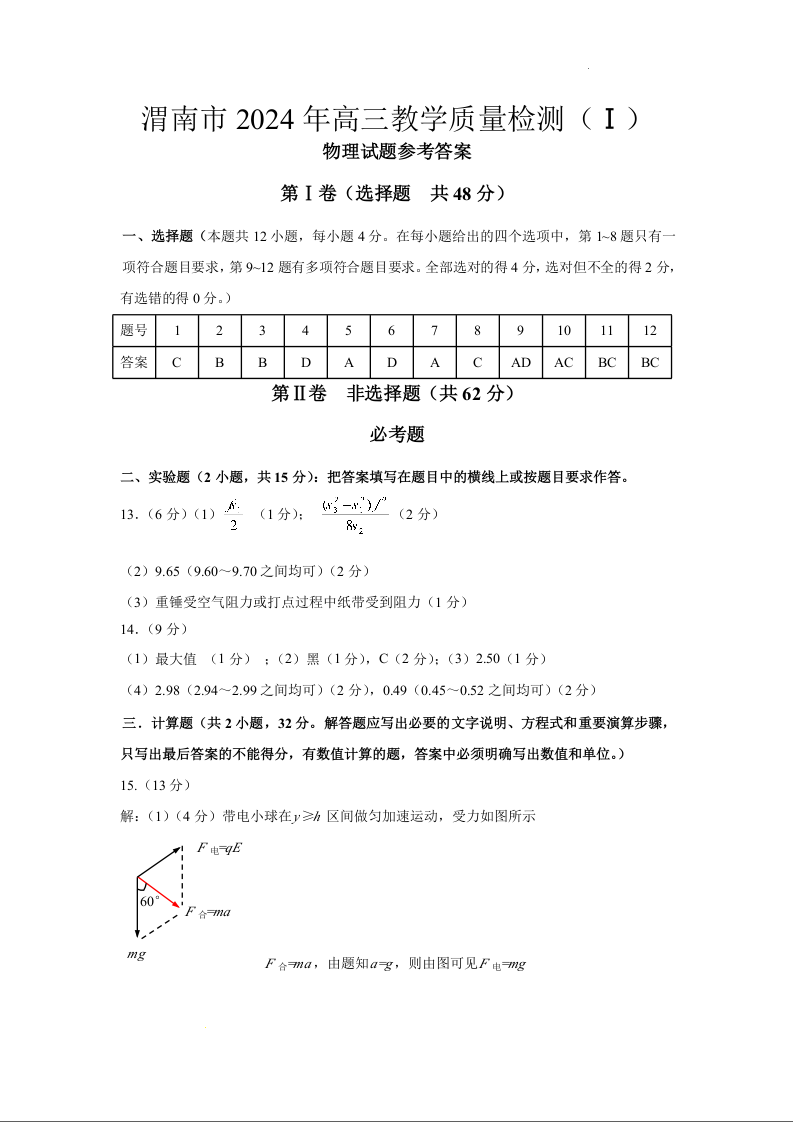 陕西省渭南市2024届高三教学质量检测(一模)物理答案