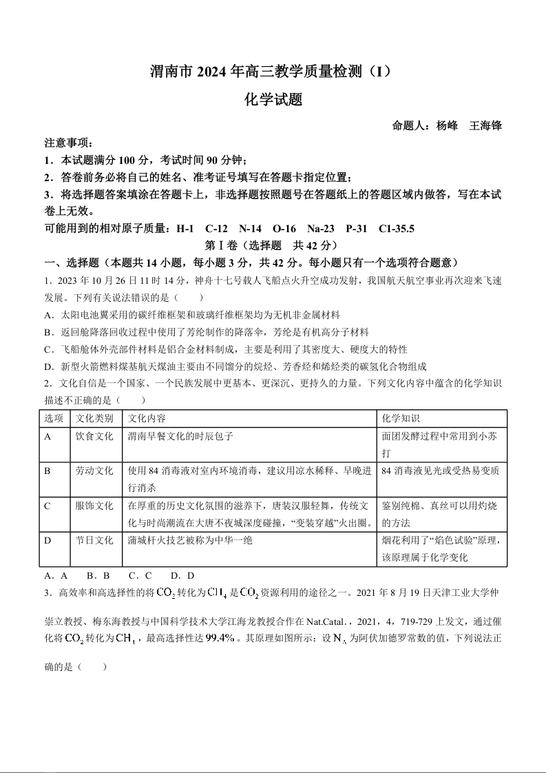 陕西省渭南市2024届高三教学质量检测(一)(渭南一模)化学