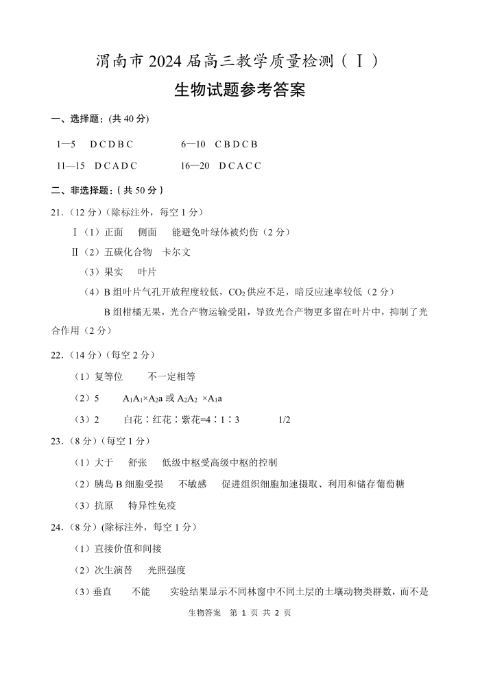 陕西省渭南市2024届高三教学质量检测(一模)生物答案