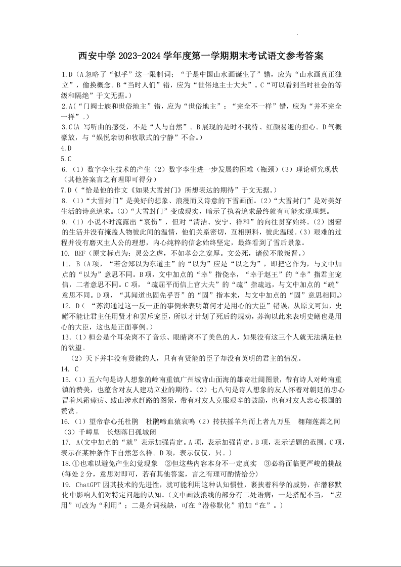 陕西省西安中学2024届高三上学期期末考试语文答案