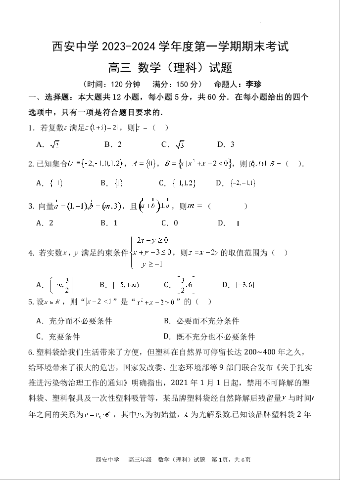 西安中学2023-2024学年度第一学期期末考试高三数学(理科)试题