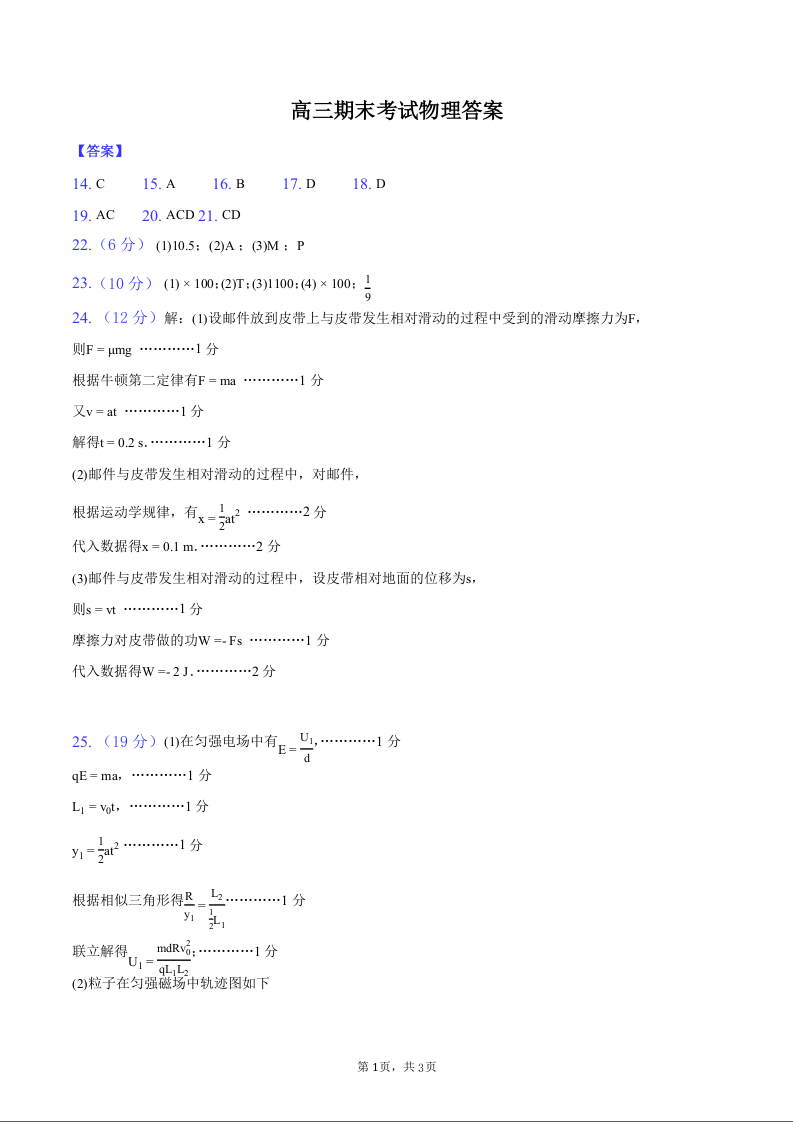 陕西省西安中学2024届高三上学期期末考试物理答案