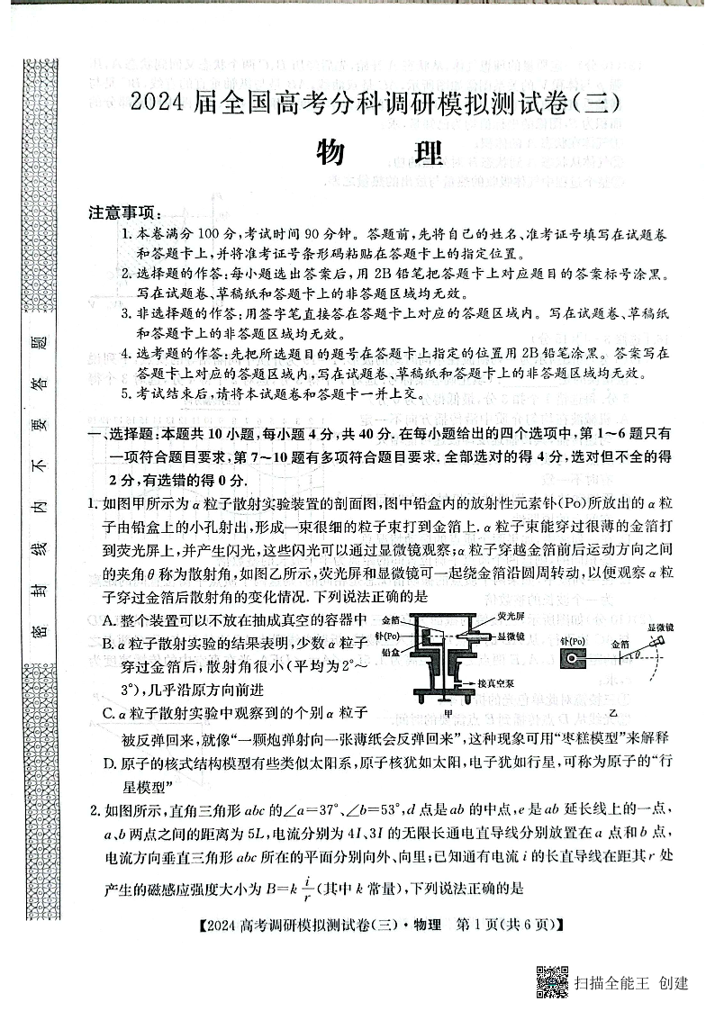 陕西省咸阳市部分高中2024届高三调研模拟测试(三)物理