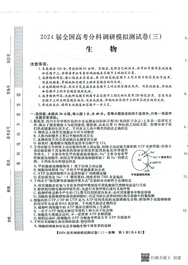 陕西省咸阳市部分高中2024届高三调研模拟测试(三)生物