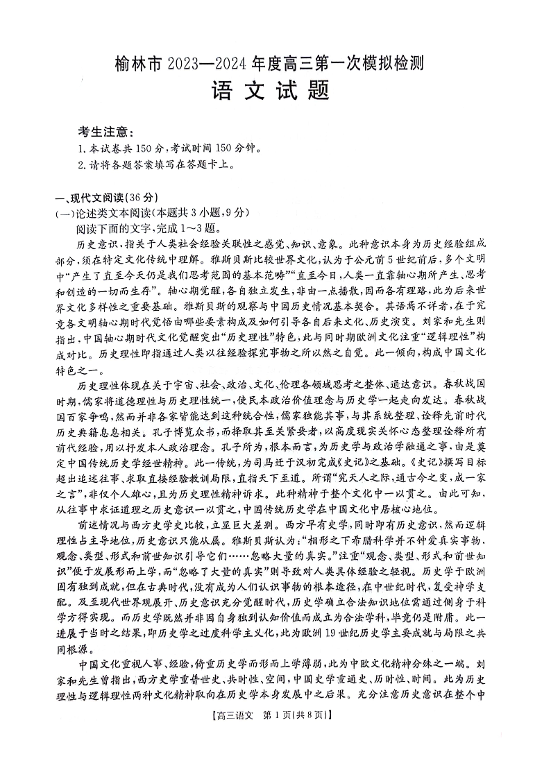 陕西省榆林市、商洛市、安康市2024届高三第一次模拟检测语文含答案