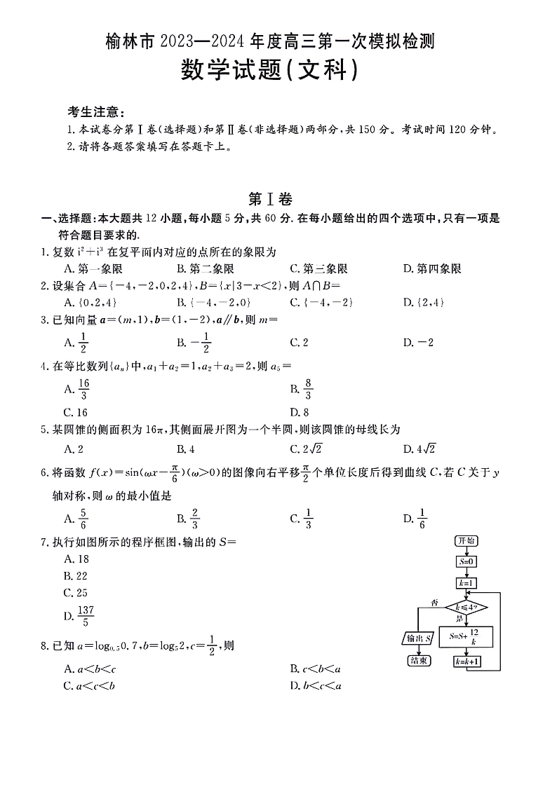陕西省榆林市、商洛市、安康市2024届高三第一次模拟检测文科数学含答案