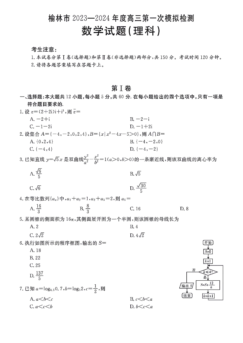 陕西省榆林市、商洛市、安康市2024届高三第一次模拟检测理科数学含答案