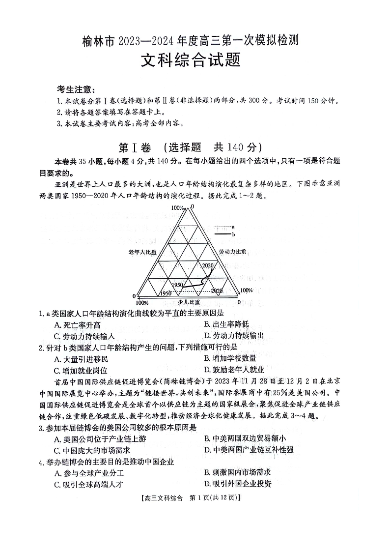 陕西省榆林市、商洛市、安康市2024届高三第一次模拟检测文综含答案