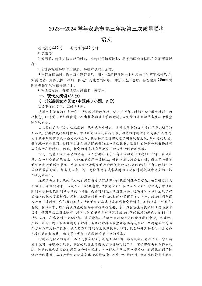 陕西省安康市2024届高三下学期第三次质量联考(三模)语文