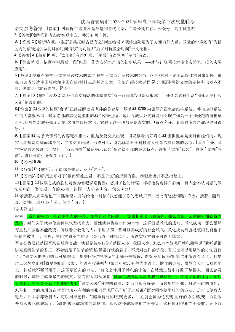 陕西省安康市2024届高三下学期第三次质量联考(三模)语文答案