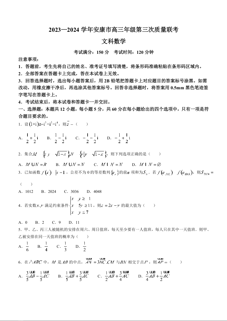 2024届陕西省安康市高三下学期第三次质量联考(三模)文科数学含答案