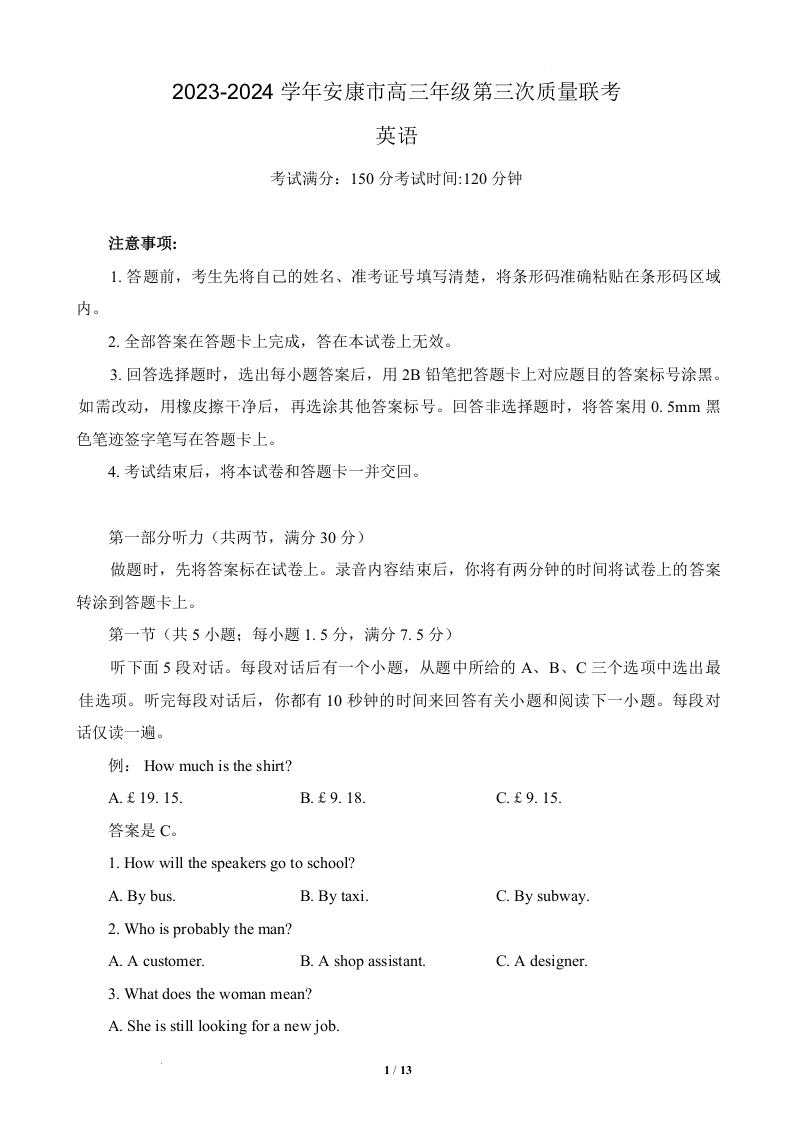陕西省安康市2024届高三下学期第三次质量联考(三模)英语