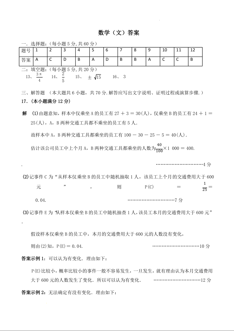 陕西省宝鸡市2024届高三下学期高考模拟检测(二)文科数学答案