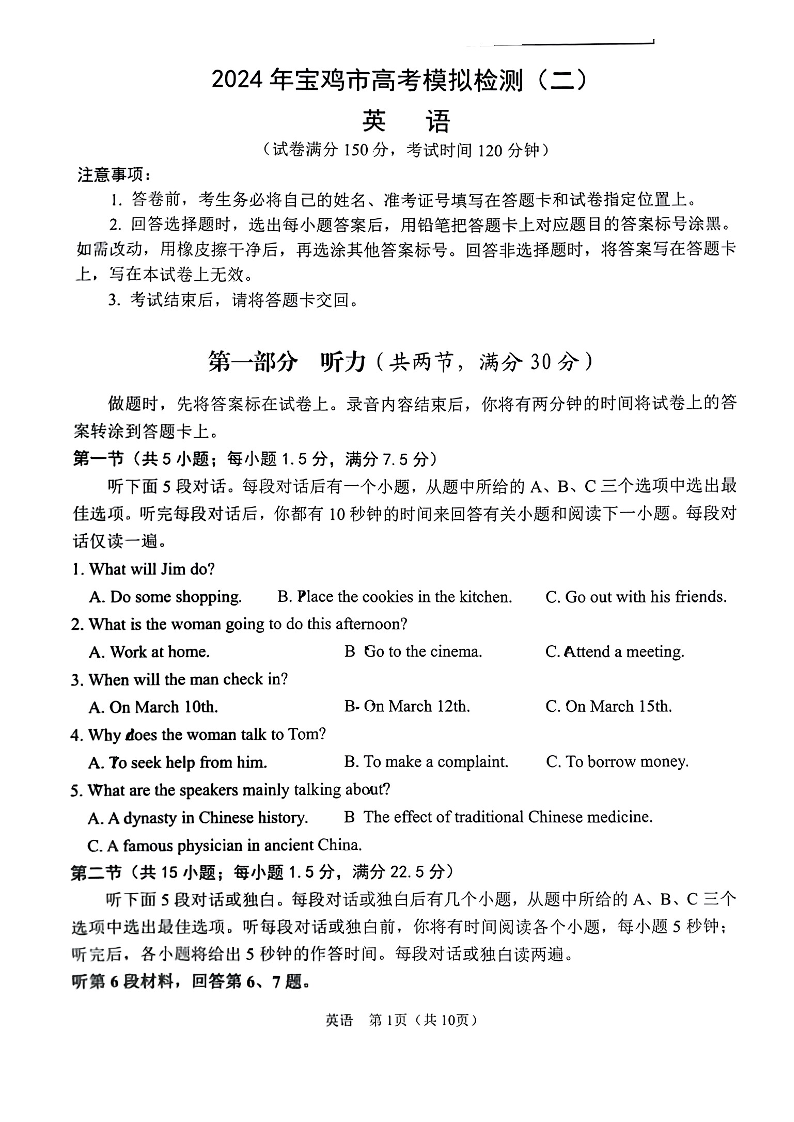 陕西省宝鸡市2024届高三下学期高考模拟检测(二)英语