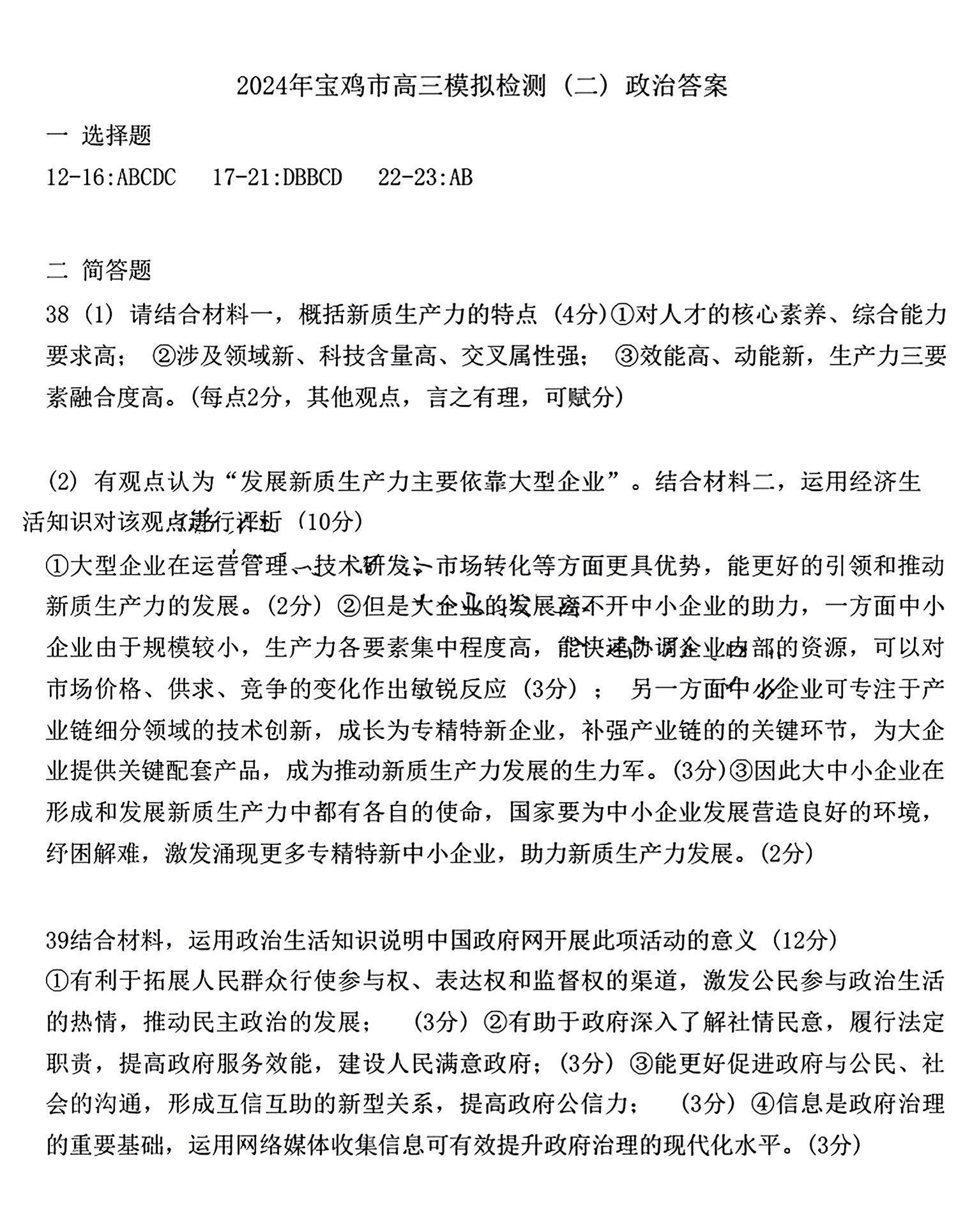 陕西省宝鸡市2024届高三下学期高考模拟检测(二)文科综合答案