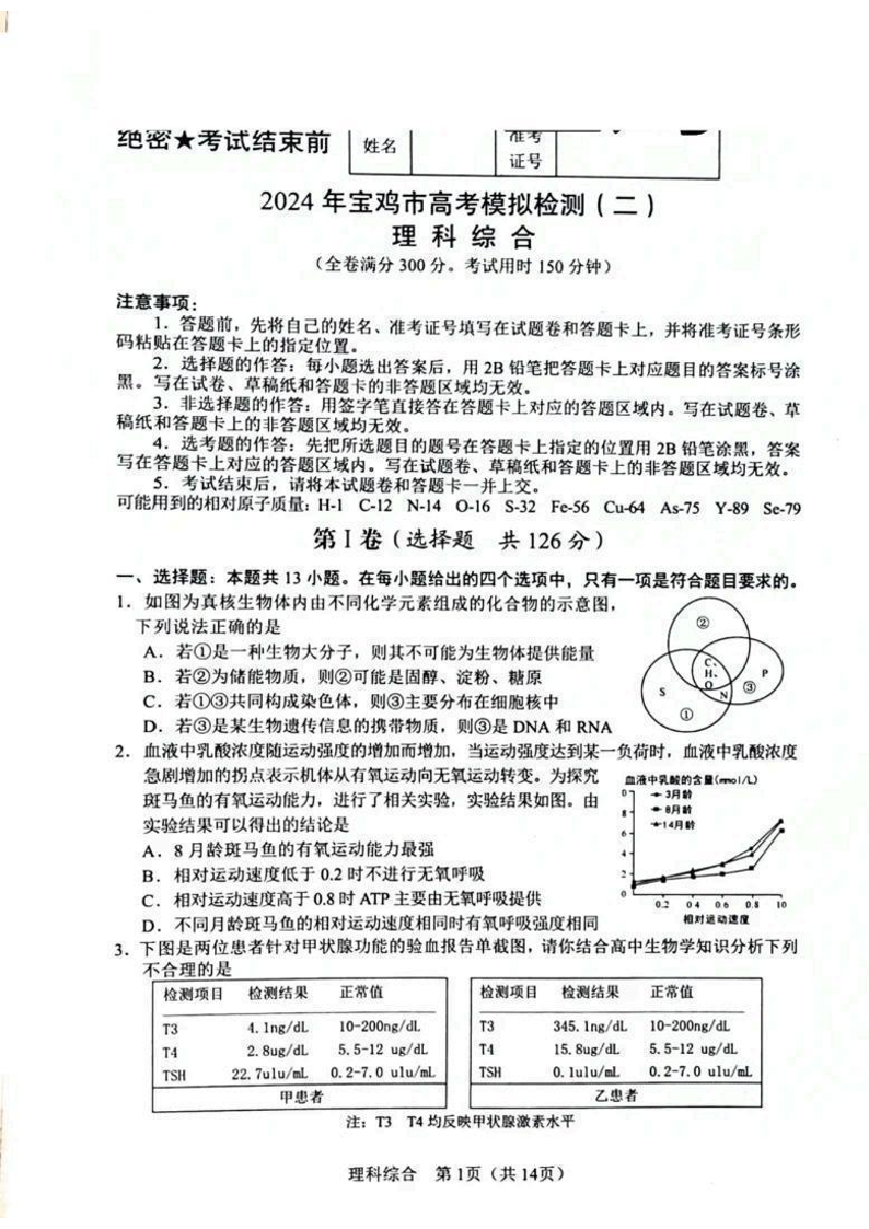 陕西省宝鸡市2024届高三下学期高考模拟检测(二)理科综合