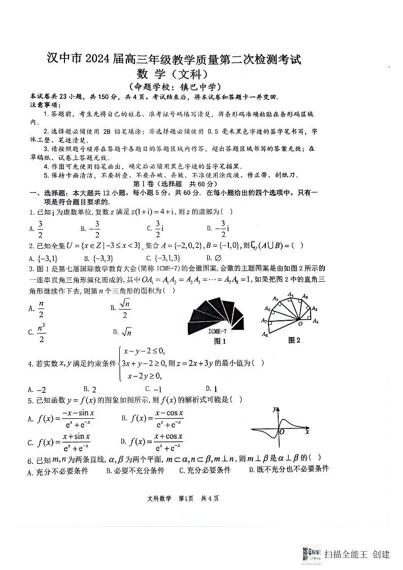 陕西省汉中市2024届高三下学期第二次检测(二模)文科数学