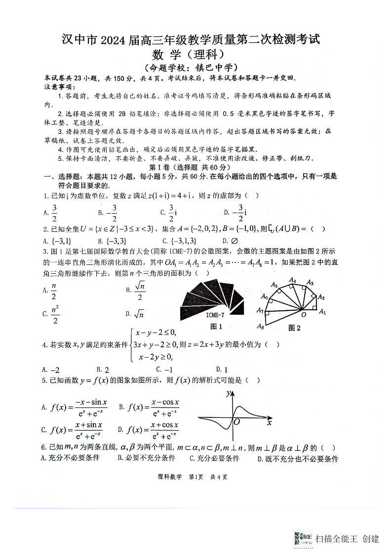 陕西省汉中市2024届高三下学期第二次检测(二模)理科数学