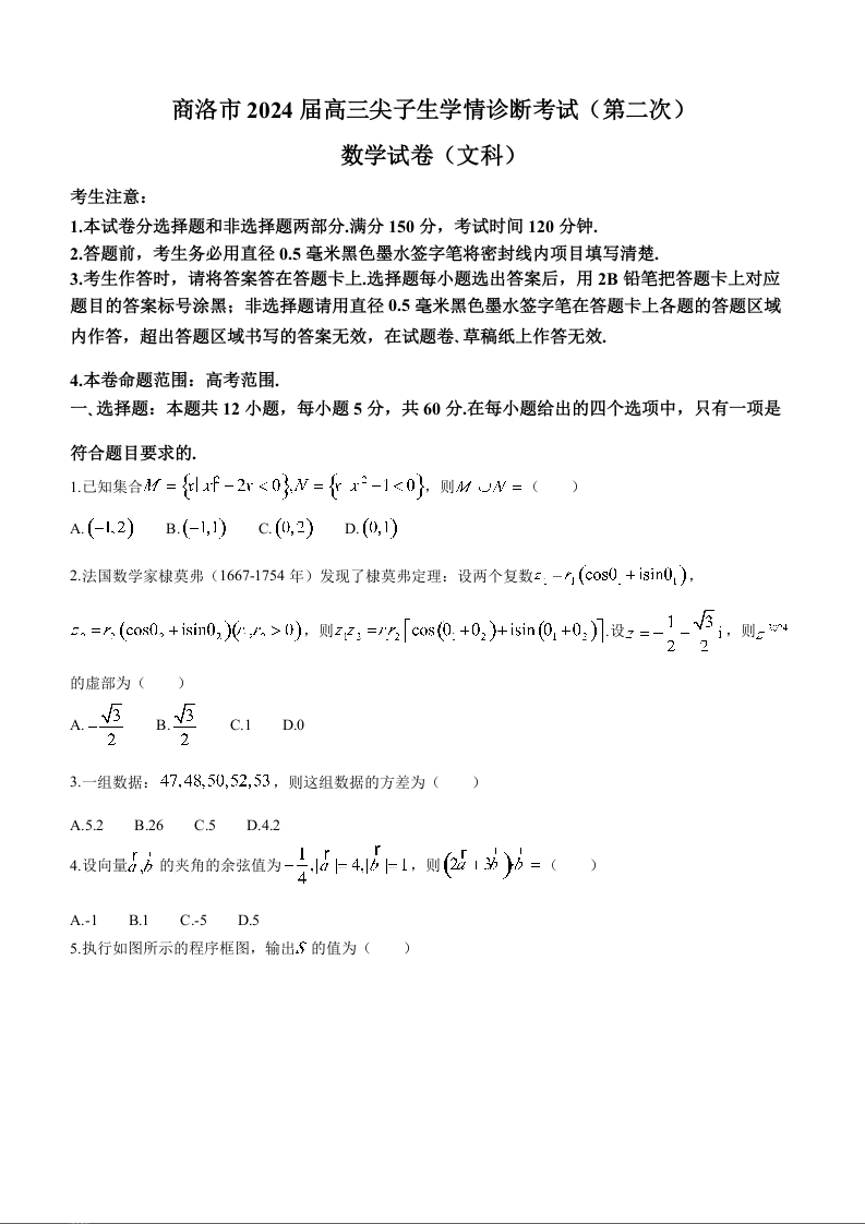 陕西省商洛市尖子生2024届高三尖子生学情诊断考试(第二次)文科数学含答案