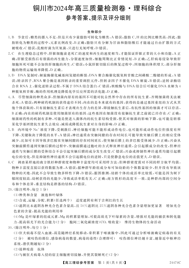 陕西省铜川市2024届高三下学期第二次模拟考试理科综合答案