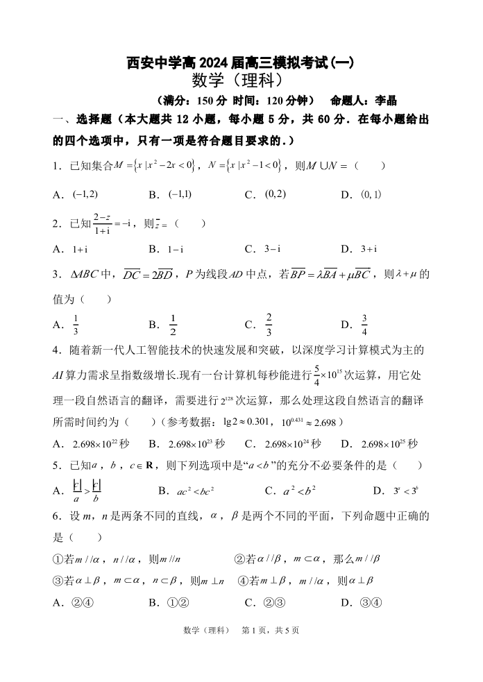 陕西省西安中学2024届高三模拟考试(一)理科数学