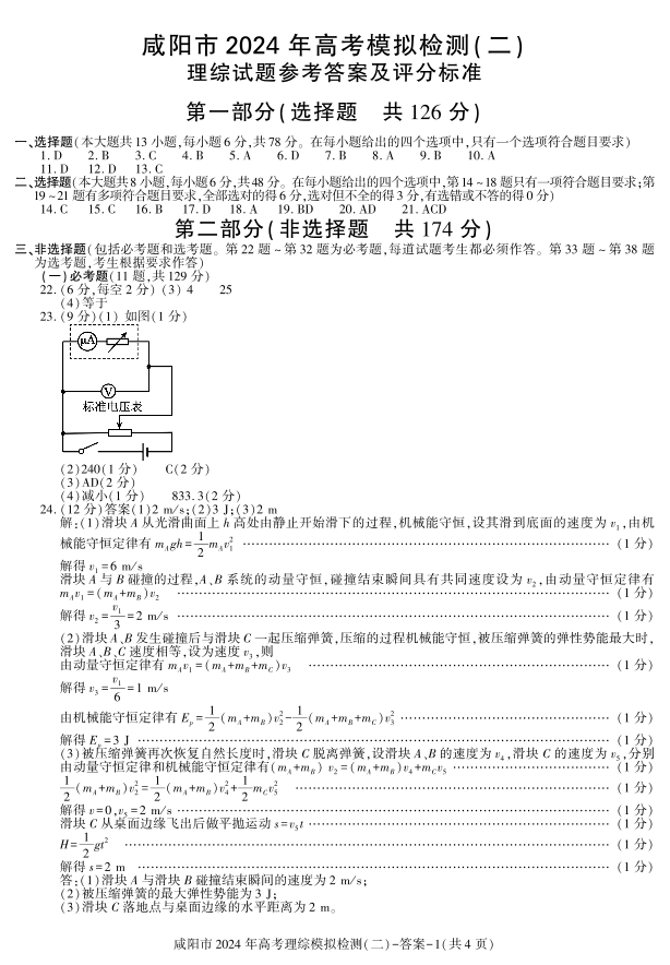 陕西省咸阳市2024届高三下学期高考模拟检测(二模)理科综合答案
