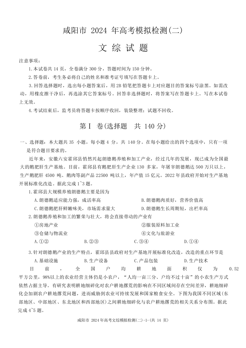 陕西省咸阳市2024届高三下学期高考模拟检测(二模)文科综合