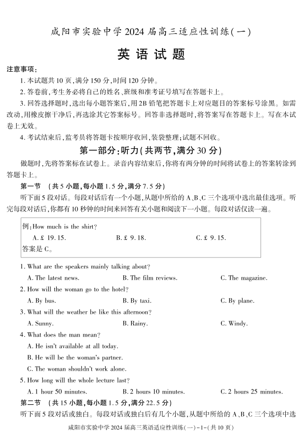 陕西省咸阳市实验中学2024届高三下学期适应训练(一)英语