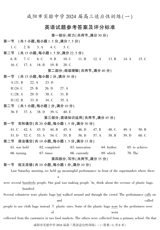 陕西省咸阳市实验中学2024届高三下学期适应训练(一)英语答案