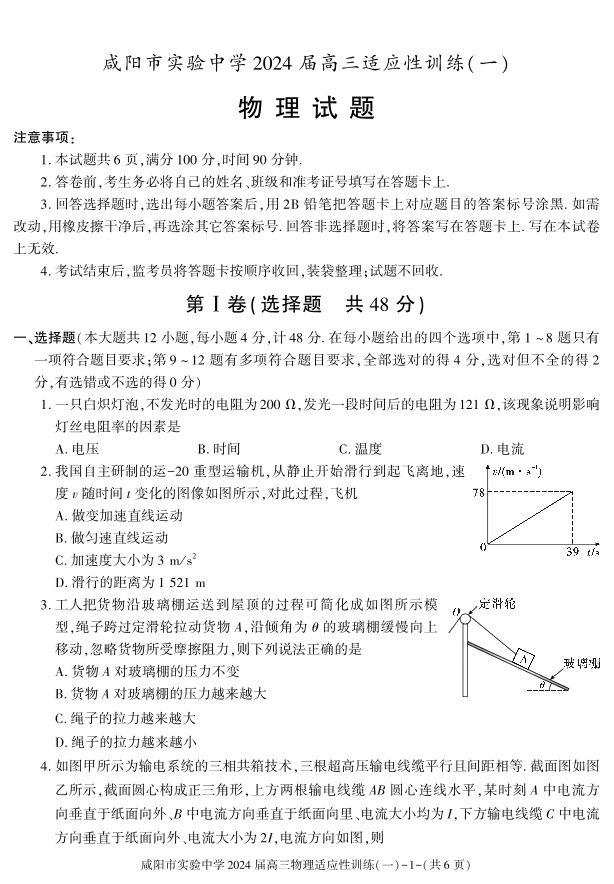 陕西省咸阳市实验中学2024届高三下学期适应训练(一)物理