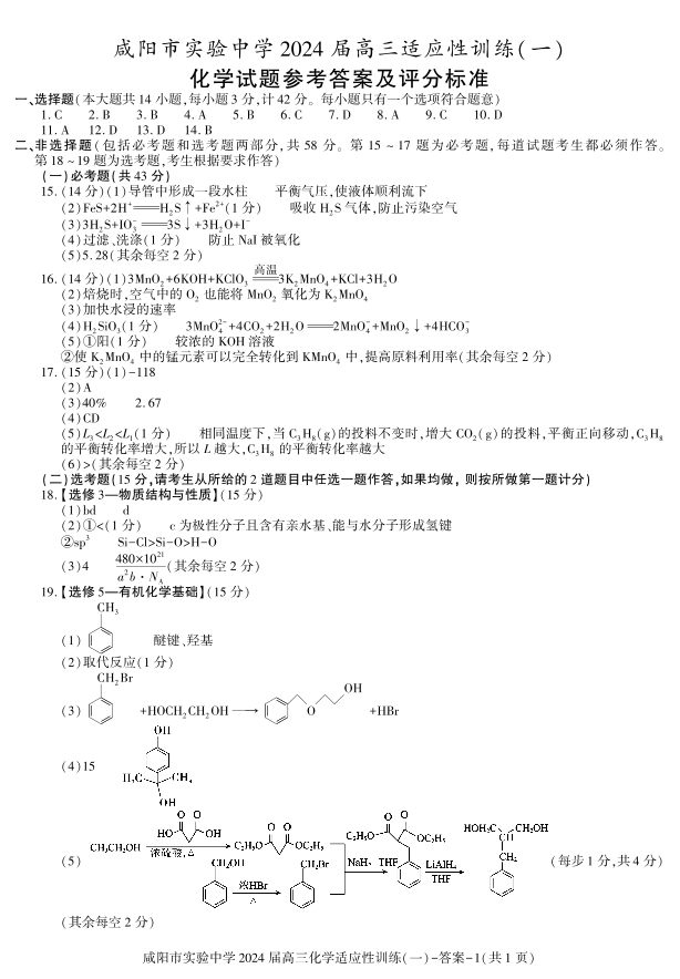 陕西省咸阳市实验中学2024届高三下学期适应训练(一)化学答案