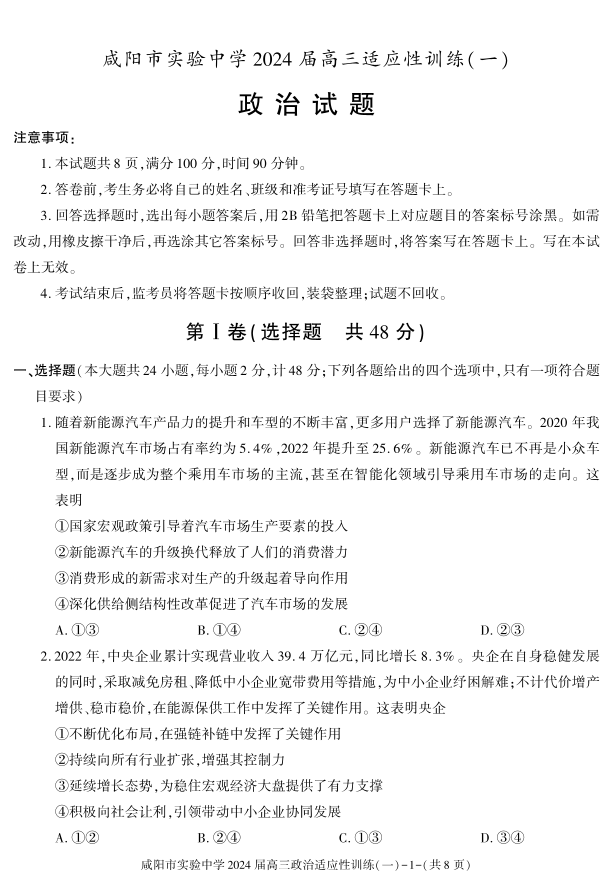 陕西省咸阳市实验中学2024届高三下学期适应训练(一)政治