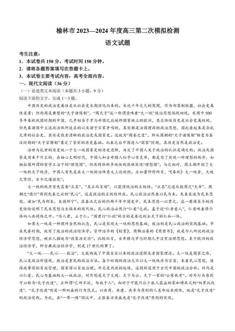 陕西省榆林市2024届高三第二次模拟考试(二模)语文含答案
