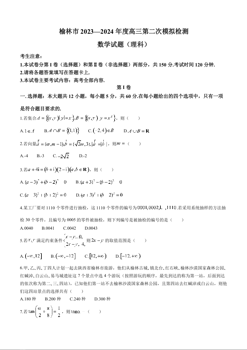 陕西省榆林市2024届高三第二次模拟考试(二模)理科数学含答案