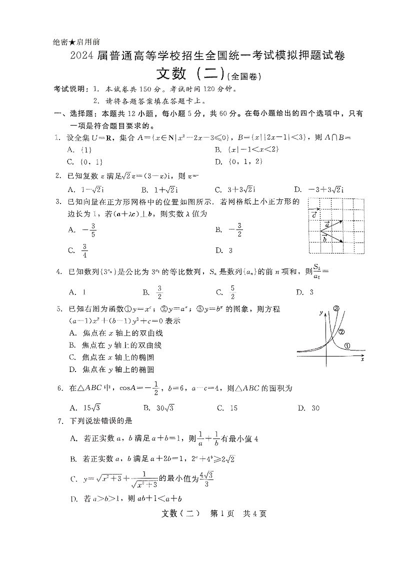 陕西省西安一中2024届普通高等学校招生全国统一考试模拟押题(二)(全国卷)文数