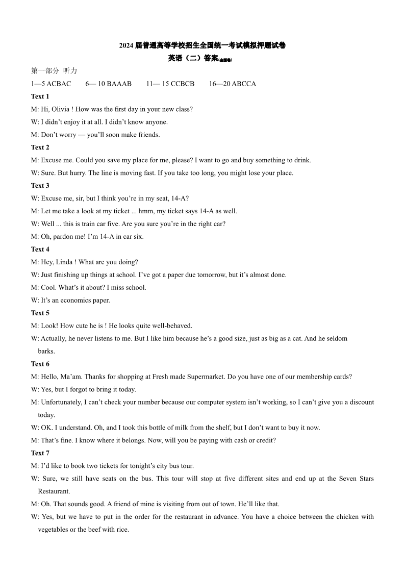 陕西省西安一中2024届普通高等学校招生全国统一考试模拟押题(二)(全国卷)英语答案