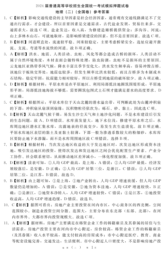 陕西省西安一中2024届普通高等学校招生全国统一考试模拟押题(二)(全国卷)文综答案